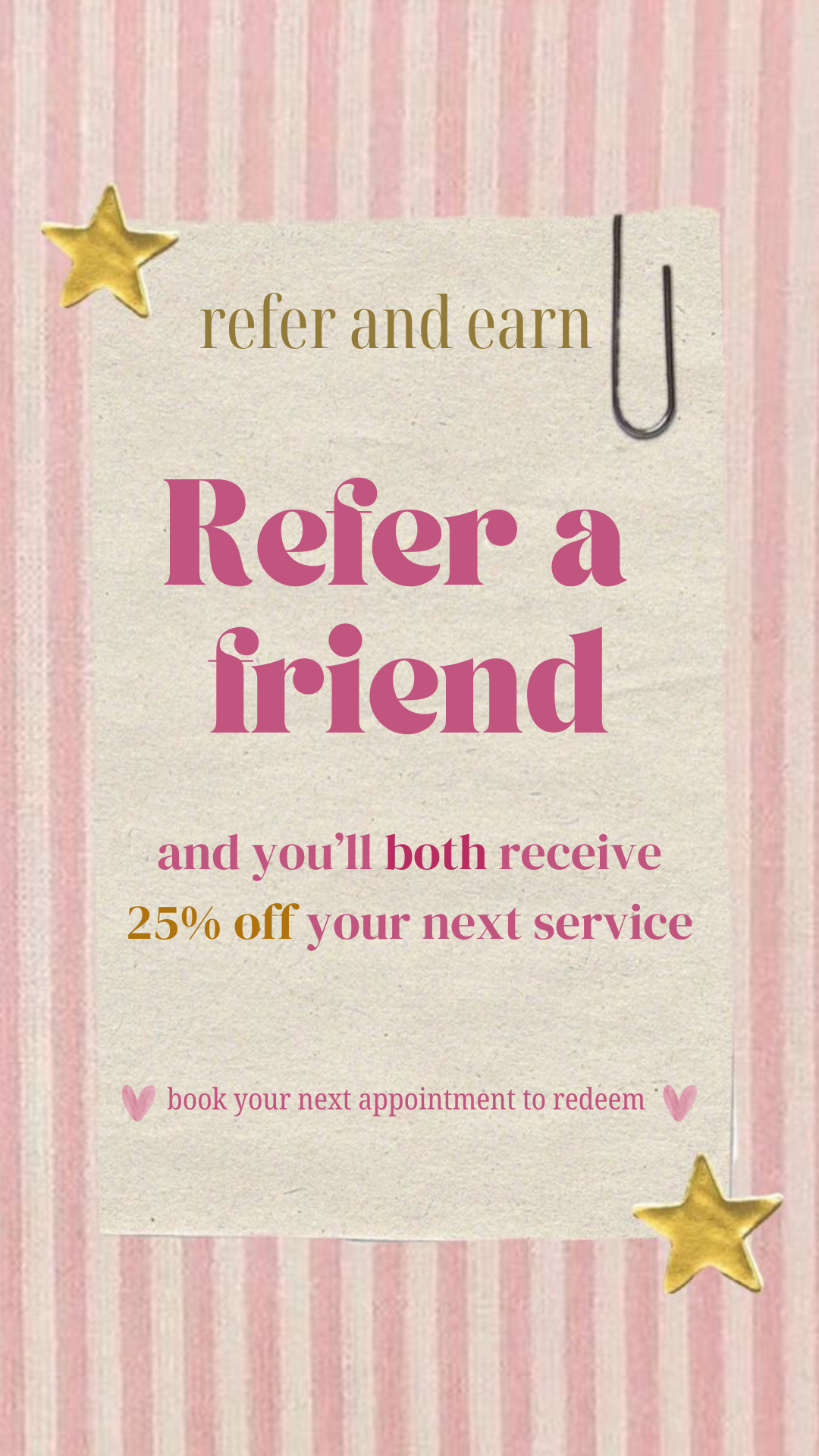 Great hair is even better when you can share it. When you refer a friend to come experience the glow, you’ll both receive 25% off your next service — because confidence is more fun together. There’s nothing more meaningful than a personal recommendation, and I’m so grateful when you trust me with your friends and family. Your referral helps support my small business, and I love being able to say thank you in return.